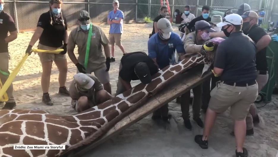 11-letnia żyrafa z zoo w Miami musiała zostać poddana narkozie. Wszystko po to, by wykonać szereg zabiegów na rozległą kulawiznę, z którą zmaga się zwierzę. Zespół specjalistów, na który składają się zarówno weterynarze, jak i pracownicy zoo, przygotowali w tym celu specjalnie zaprojektowane gumowe podeszwy. Majestatyczne zwierzę ma prawie 5 metrów wysokości i waży aż 900 kilogramów.