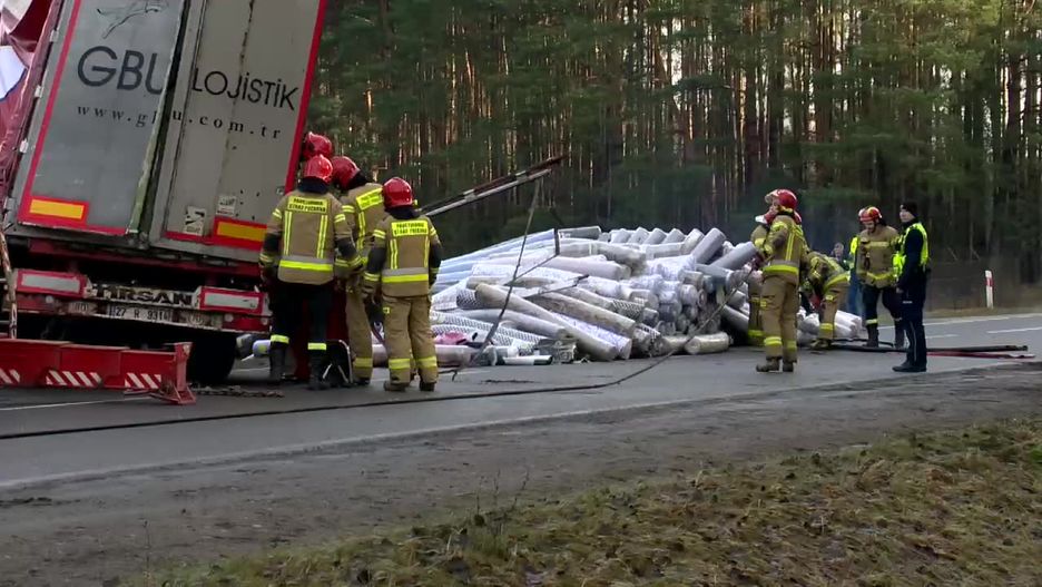 Ciężarówka z naczepą wpadła w poślizg i przewróciła się na bok. Wysypały się dywany