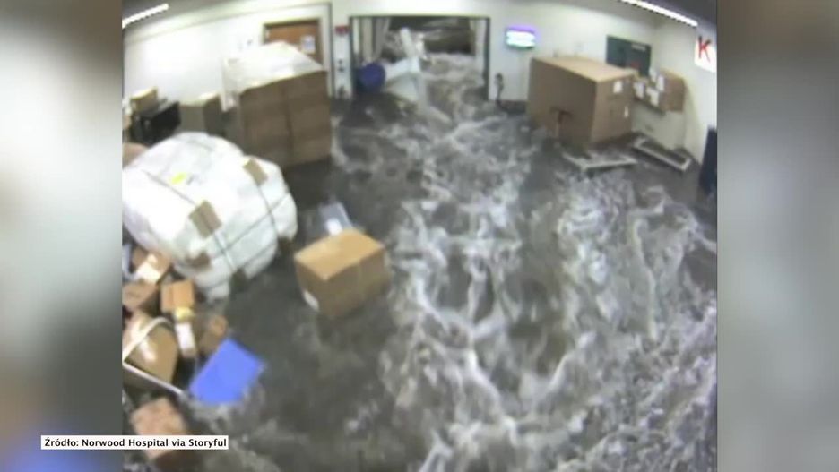 Szpital z miasta Norwood w Massachusetts opublikował nagranie z momentu wdarcia się do placówki potężnej fali powodziowej. Na filmie widać, jak naporu wody nie wytrzymują drzwi, które najpierw się uchylają aż w końcu otwierają się na oścież. Nagromadzona na zewnątrz deszczówka momentalnie wypełnia cały korytarz oraz inne pomieszczenia.