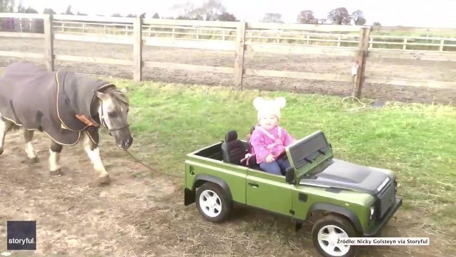 Niespełna roczna dziewczynka wyprowadza kucyka, jadąc w… Land Roverze na akumulator
