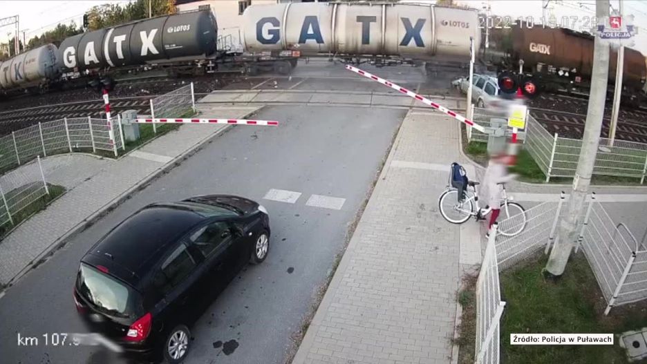 Nagranie z kamery umieszczonej przy przejeździe kolejowym w miejscowości Skoki (woj. lubelskie) mrozi krew w żyłach. Widać na nim, jak jeden z kierowców omija stojące przed przejazdem samochody, przejeżdża chodnikiem tuż obok rowerzystki. Następnie wyłamuje opuszczoną rogatkę i wjeżdża pod pociąg.
