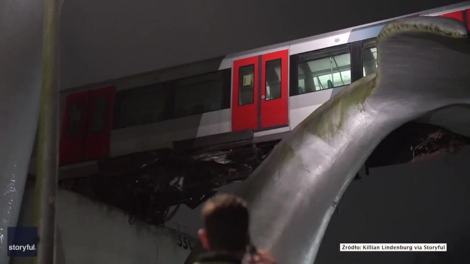 Pociąg metra w Rotterdamie wykoleił się i zawisł na 10-metrowym wiadukcie. Przed upadkiem uchronił go znajdujący się tuż obok wiaduktu pomnik o kształcie ogona wieloryba. Nikomu nic się nie stało.