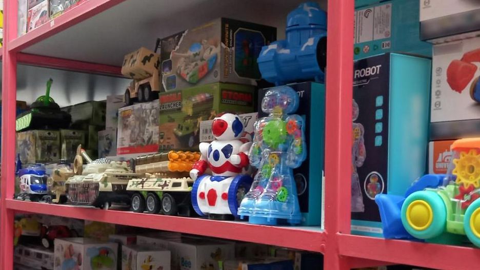 Zabawki znajdowały się wewnątrz boksu handlowego. Były poukładane na regałach sklepowych, w koszach oraz przed pomieszczeniem handlowym. Część zabawek leżała luzem na ziemi. Pracownicy pakowali pojedyncze zabawki w zestawy.