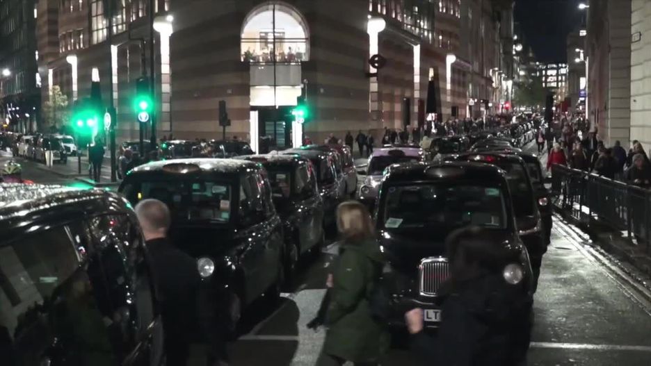 Protest taksówkarzy w centrum Londynu. Licencjonowani przewoźnicy domagają się dostępu do wszystkich obszarów miasta. Niedawno wprowadzone przepisy zakładają, że niektórych częściach stolicy Anglii uprzywilejowanymi pasami mogą poruszać się tylko autobusy, natomiast taksówki już nie.