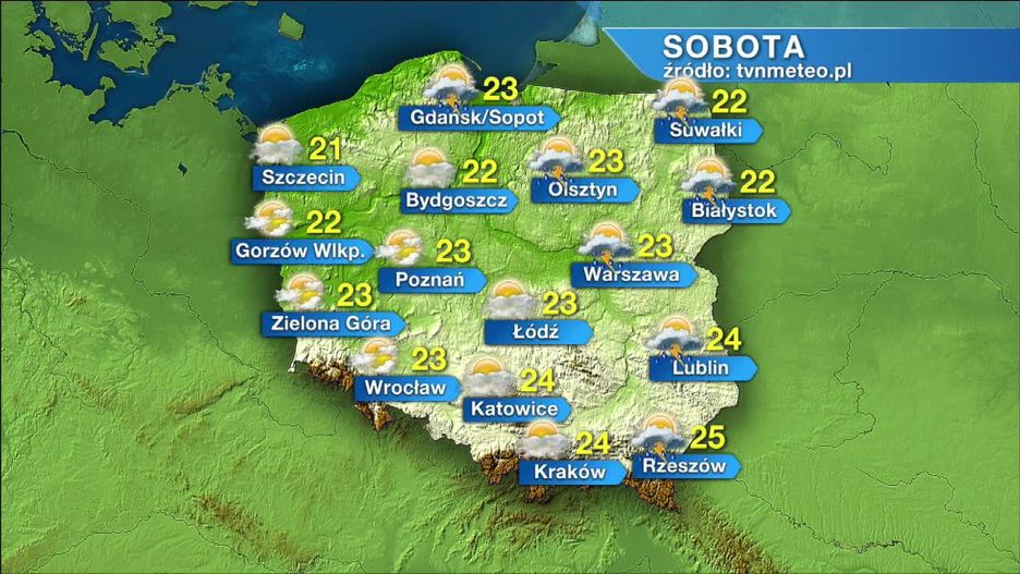 Sobota na wschodzie kraju zapowiada się z większą ilością chmur oraz przelotnymi opadami deszczu i burzami (10-20 mm). Na pozostałym obszarze będzie pogodnie. Temperatura maksymalna wyniesie od 21 st. C na Nizinie Szczecińskiej do 25 st. C na Podkarpaciu. Powieje słaby i umiarkowany wiatr, południowo-wschodni. W porywach burzowych może osiągnąć do 80 km/h.
