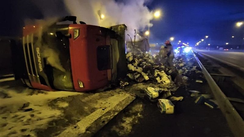 Około godz. 05.05 oficer dyżurny Komendy Miejskiej Policji w Legnicy został powiadomiony o zdarzeniu drogowym na 89 km autostrady A-4 kierunek Zgorzelec. Ze wstępnych ustaleń policjantów wynika, że kierujący pojazdem ciężarowym marki Scania najprawdopodobniej zasnął za kierownicą zjechał na bariery energochłonne i przewrócił się na bok. W wyniku tego zdarzenia auto zapaliło.. Obecnie trwa akcja gaśnicza samochodu. przewożącego artykuły higieniczne (pieluchy).