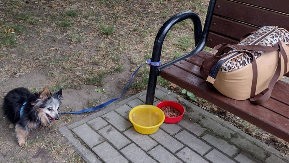 Na skwerze przy ulicy Szafera w Łodzi, ktoś przywiązał starszego psa do ławki. Obok zwierzęcia pozostawiono miski z karmą i wodą oraz torbę z wyprawką.