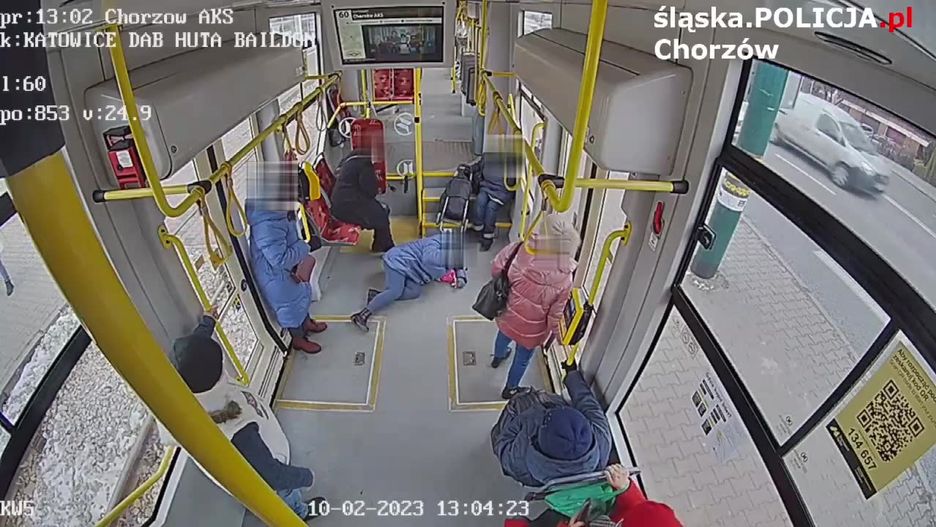 32-latka została potrącona i z urazem głowy przewieziono ją do szpitala. Urazu kręgosłupa oraz nogi doznała też 75-letnia pasażerka tramwaju, która przewróciła się, gdy pojazd gwałtownie zahamował. Na nagraniu opublikowanym przez policję widać też, co działo się w tramwaju w momencie hamowania.