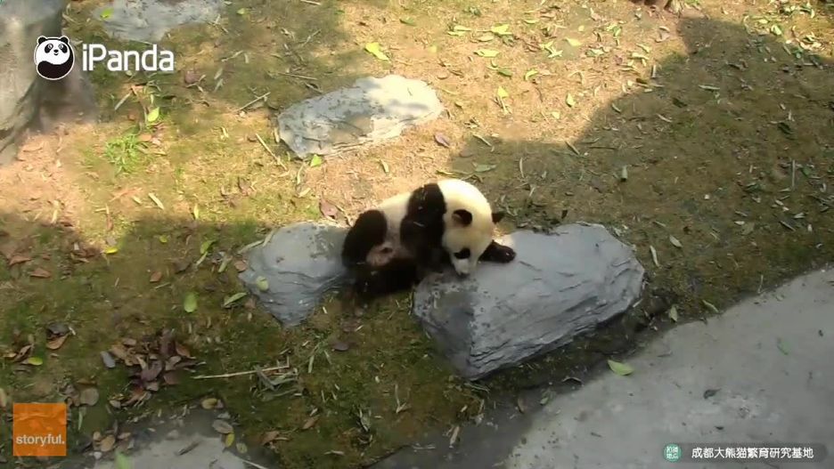 Mały niedźwiadek panda turla się z górki popisując się przed swoją mamą