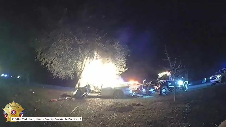 W Houston w stanie Teksas policjanci uratowali kierowcę z płonącego samochodu. Do wypadku doszło nad ranem. 20-letni kierowca zasnął w czasie jazdy i uderzył w drzewo, co spowodowało zapalenie się jego auta.